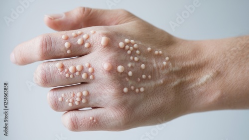 Close-up image of a hand with numerous small, pale bumps, possibly indicating a skin condition.