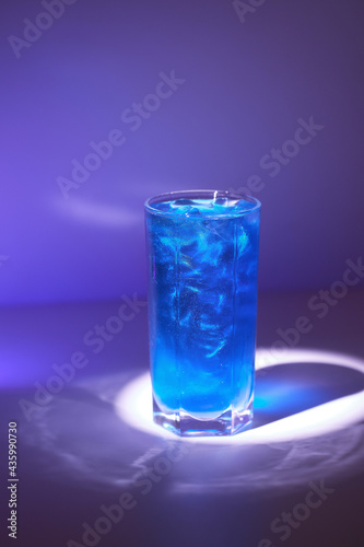Closeup image of shining cocktail with shimmer at blue minimal background with reflections.