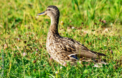 Close-up in full-length profile of a female mallard duck. A young mallard has come out onto the bank overgrown with green grass and is looking curiously at the camera.