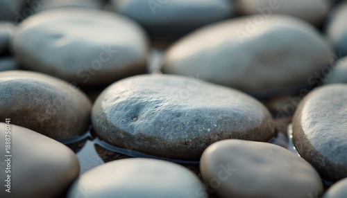 Close-up Macro View of Smooth Wet River Stones in Water.