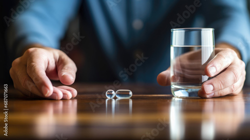 Closeup man holding a glass of water preparing to take a medicine from the table