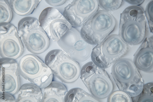 Close-up: many daily contact lenses in a disposable protective case, in which clear lenses float, lying on a white background. The concept of ophthalmology, vision correction, eye care. High quality