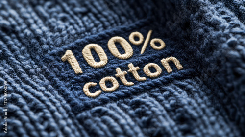 Close-up of 100 percent cotton label on blue textured fabric revealing detailed stitching