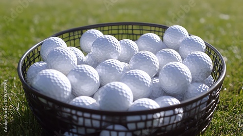 Close-up of a basket filled with white golf balls resting on green grass, perfect for sports and leisure photography.