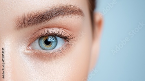 Close-up of a beautiful blue eye with detailed eyelashes and smooth skin, highlighting natural beauty.