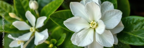 Close-up of a beautiful white Stephanotis floribunda flower plant in full bloom, with small, delicate petals and green leaves, petals, green, white