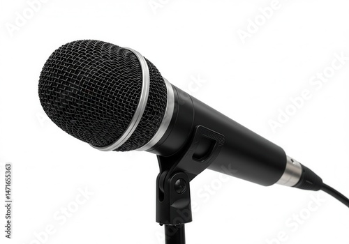 Close-up of a black dynamic microphone on a stand against a white background in a studio setting