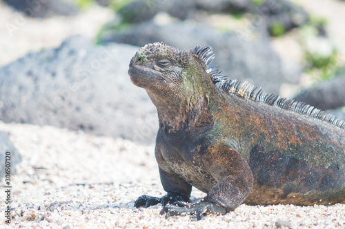 Close-up of a black iguana on white sand, in profile, Galapagos, Ecuador. Focus on the face, the rest is blurred.