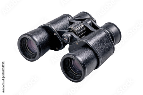 Close-up of a black, vintage-style binoculars. The binoculars feature a dark, textured casing, focusing wheel, and visible lenses
