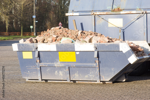 Closeup of a blue dumpster with construction waste in the Netherlands