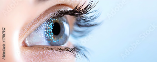 Close-up of a blue eye, looking right, light blue background, ophthalmology, healthcare