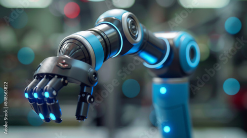 Close-up of a blue robotic arm with glowing lights, showcasing advanced technology and modern engineering in a laboratory setting.