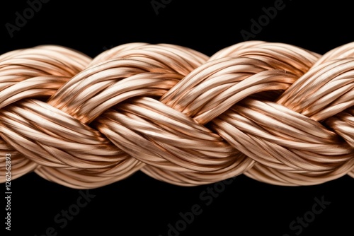 Close-up of a braided copper rope on black background, showcasing its metallic texture and intricate weave.