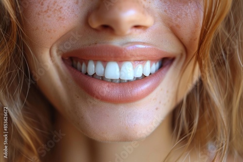 Close-up of a bright smiling European young woman showing off healthy white teeth