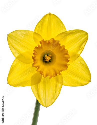 Close-up of a bright, vibrant daffodil flower with six petals and a prominent corona