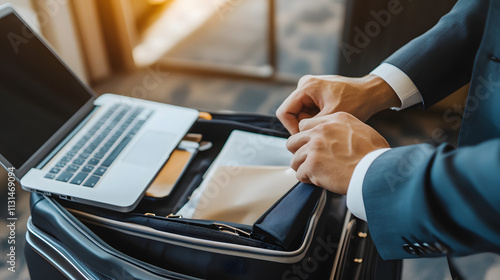 Close-up of a businessman packing a laptop and documents into his suitcase. He's dressed in a sharp suit, preparing for travel or a business trip.