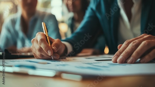 Close-up of a businessperson reviewing financial reports with a pen, focusing on data and strategy in a collaborative office meeting.