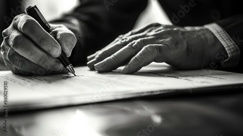 Close-up of a businessperson signing a document in black and white, representing legal, business, and professional themes.