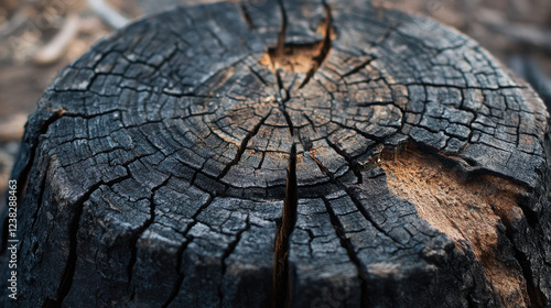 Close-up of a charred tree stump, showcasing its cracked texture and natural patterns.