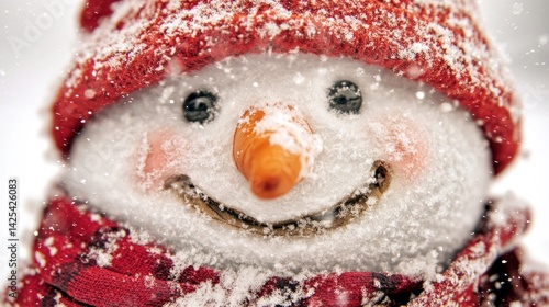 Close-up of a cheerful snowman face covered in snow, wearing a red hat and scarf