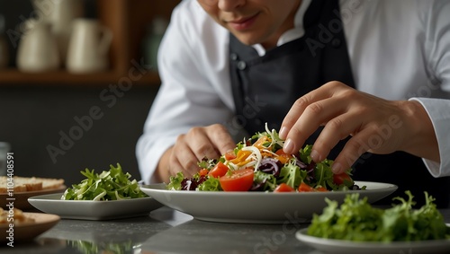 Close-up of a chef plating a salad.