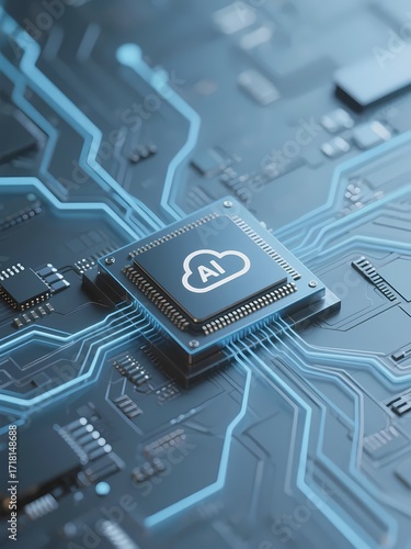 Close-up of a circuit board with an AI chip featuring a cloud symbol, highlighting advanced technology and connectivity.