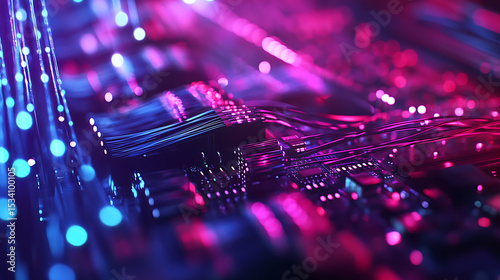 Close-up of a Circuit Board with Fiber Optics in Neon Lighting