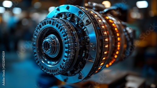 Close-up of a complex metallic industrial machine component with illuminated elements.