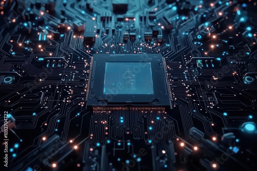Close-up of a computer microchip with glowing circuits on a dark surface, highlighting technological advancement and innovation.