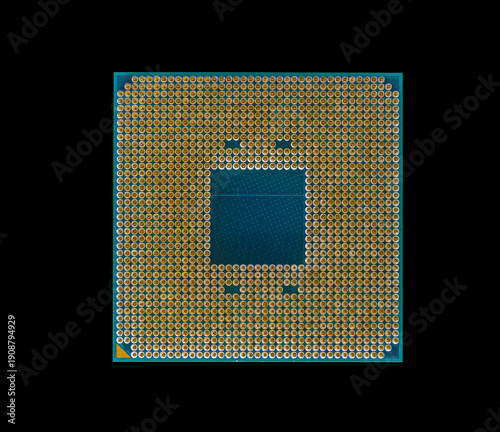 Close-up of a computer processor with gold-plated pins isolated on a black background