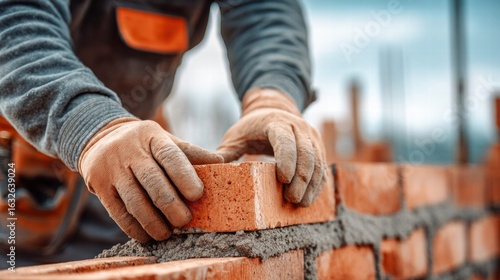 Close-up of a construction worker laying bricks, building a wall.