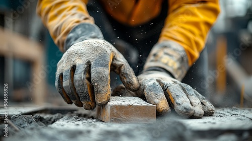 Close-up of a Construction Worker's Hands Placing Concrete Blocks