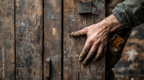Close-Up of a Craftsman’s Hand Gripping Rustic Wooden Planks with Texture Showing Signs of Wear, Symbolizing Hard Work and Artisanal Skill in Traditional Woodworking