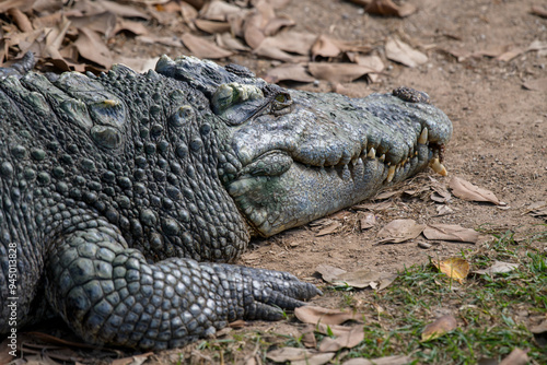 Close-up of a crocodile's head, showing its mouth and sharp teeth.
