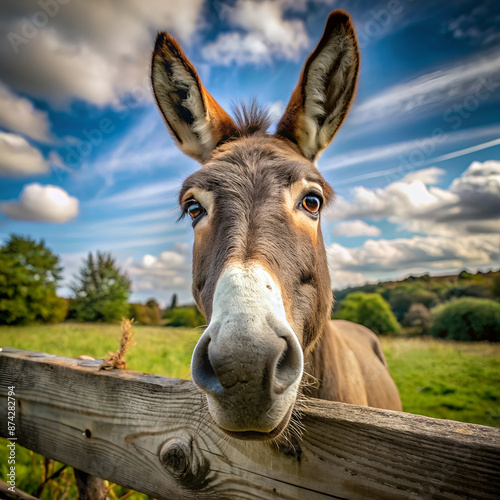 Close-up of a curious donkey peeking over a wooden fence in a sunny field