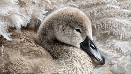 Close-up of a cygnet nestled amongst soft, fluffy feathers, head resting peacefully