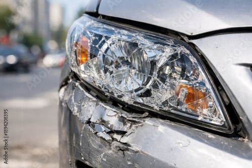 Close-up of a damaged headlight on a silver car after a minor traffic accident.