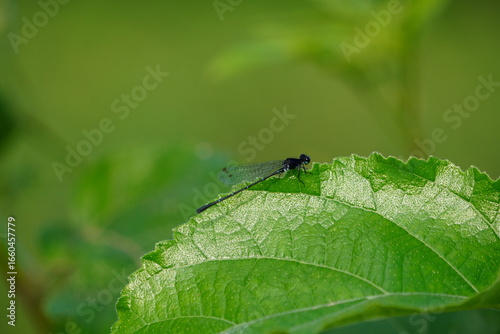 Close-up of a damselfly on the edge of a green leaf with a blurry greenary background