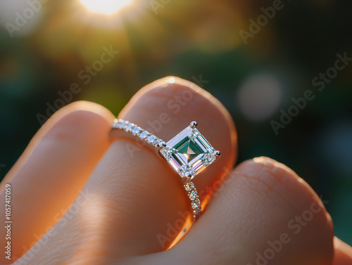 Close-up of a dazzling emerald-cut engagement ring catching the sunlight on a finger.