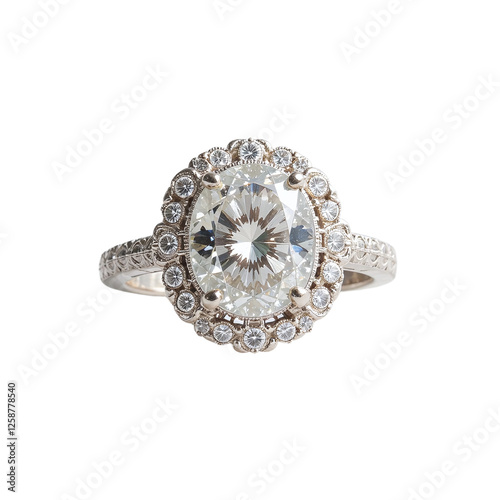 Closeup of a dazzling oval diamond halo ring with intricate details.