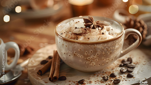 Close-up of a Delicious Cup of Coffee with Whipped Cream and Spices