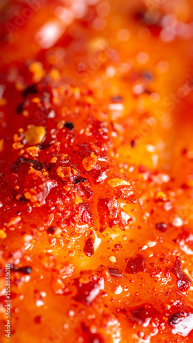 Close-up of a delicious, spicy dish garnished with vibrant red seasoning, showcasing culinary art.