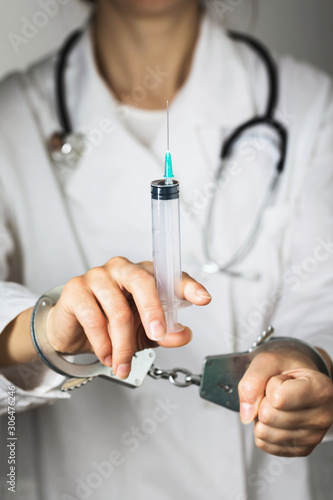 Close-up of a doctor in handcuffs with a syringe in his hands. The concept on the introduction of prohibited drugs to patients