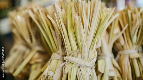 Close-up of a dried lemongrass bundle, neatly tied with natural string, aromatic and clean