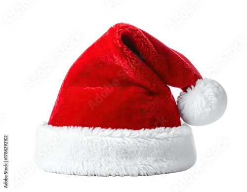 Close-up of a festive, red holiday head covering with white trim and a fuzzy pom-pom