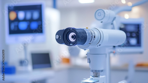 "Close-up of a fragment of an ophthalmic laser system in an eye surgery clinic, with selective focus."