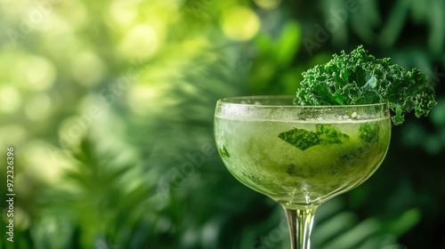 Close-up of a fresh green kale cocktail, served in a stylish glass, against a background that blurs into greenery.