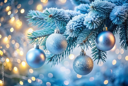 Close-Up of a Frosty Blue Christmas Tree Branch with Round Ornaments for a Festive Holiday Scene in High Depth of Field