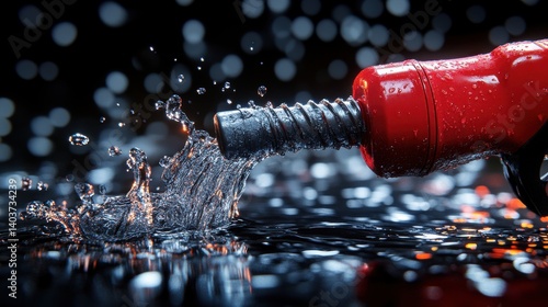 Close-up of a fuel nozzle with water splashing dynamically in a dramatic lighting setting.