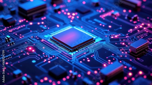 Close-up of a futuristic electronic circuit board highlighting a central microchip integrated with neon pink and blue ambient lighting for technological innovation and digital systems